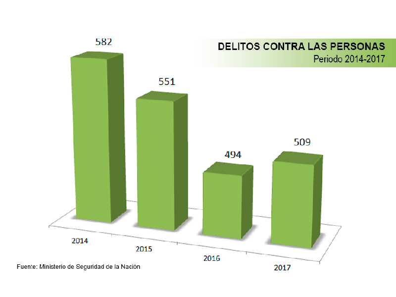 Asimismo, la cantidad de víctimas de delitos contra las personas tuvo una disminución del 12,9%. En 2014 se registraron 582 casos por cada 100.000 habitantes, cifra que se redujo a 509 en 2017.