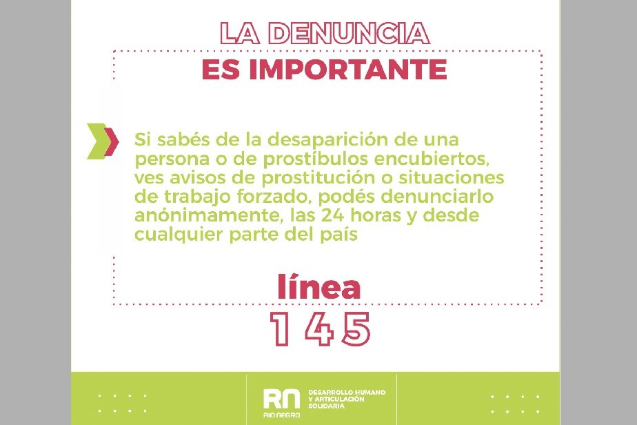 A la trata la combatimos entre todas y todos. Si estás al tanto de la desaparición de una persona o de prostíbulos encubiertos, has visto avisos de prostitución o situaciones de trabajo forzado, podés denunciarlo anónimamente las 24 horas y desde cualquier parte del país a la línea gratuita 145.