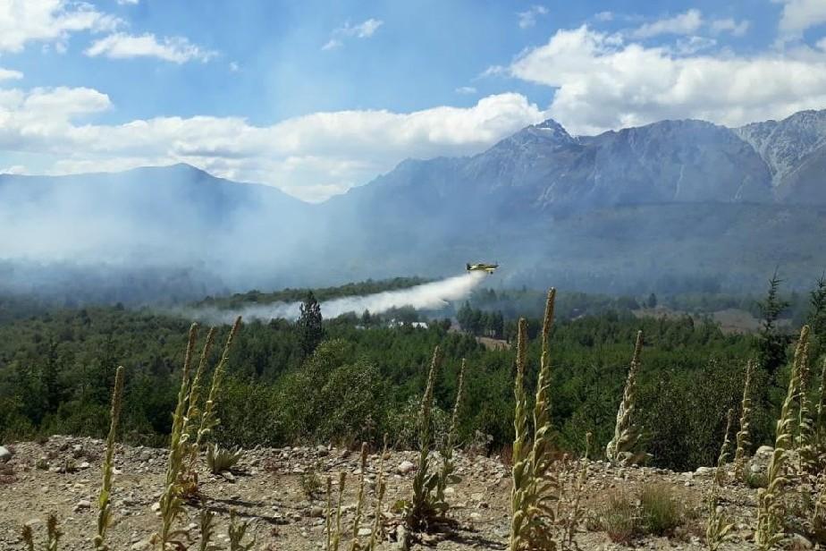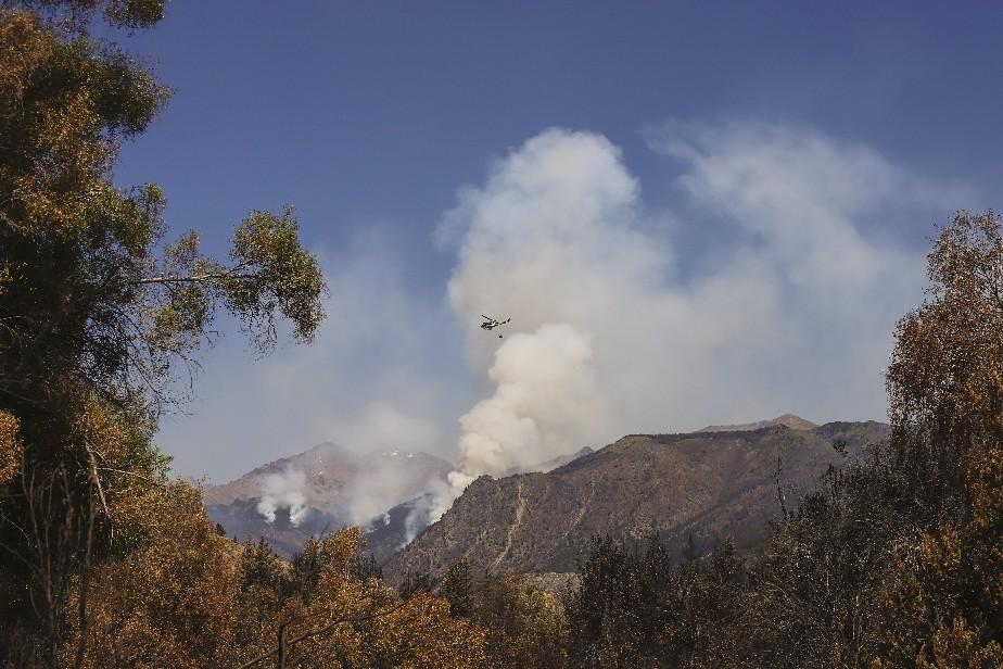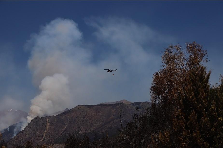 Cuatro helicópteros y tres aviones hidrantes aportados por el Servicio Nacional de Manejo del Fuego refuerzan el extenuante trabajo de los brigadistas en el incendio de El Bolsón.