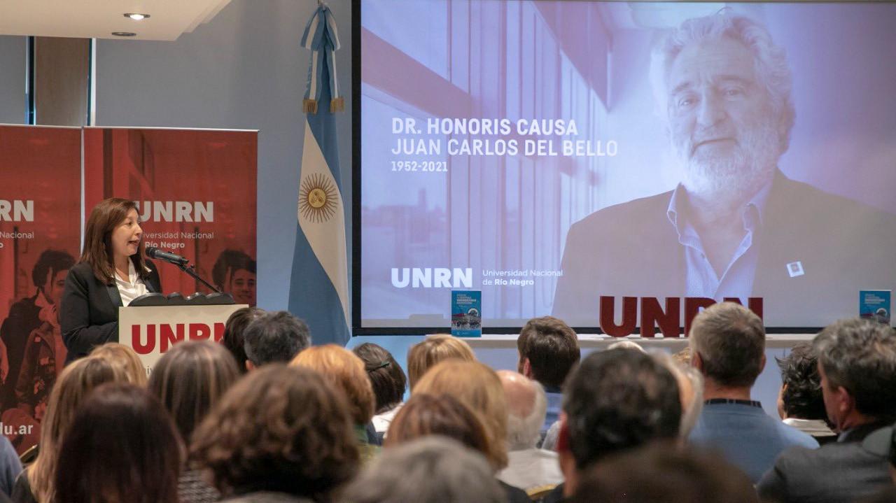 La Universidad Nacional de Río Negro (UNRN) entregó hoy el título de Doctor Honoris Causa Post Mortem al ex rector de la institución, Juan Carlos Del Bello. El acto se desarrolló en San Carlos de Bariloche, con la presencia de la Gobernadora Arabela Carreras y el Ministro de Educación de la Nación, Jaime Perczyk.