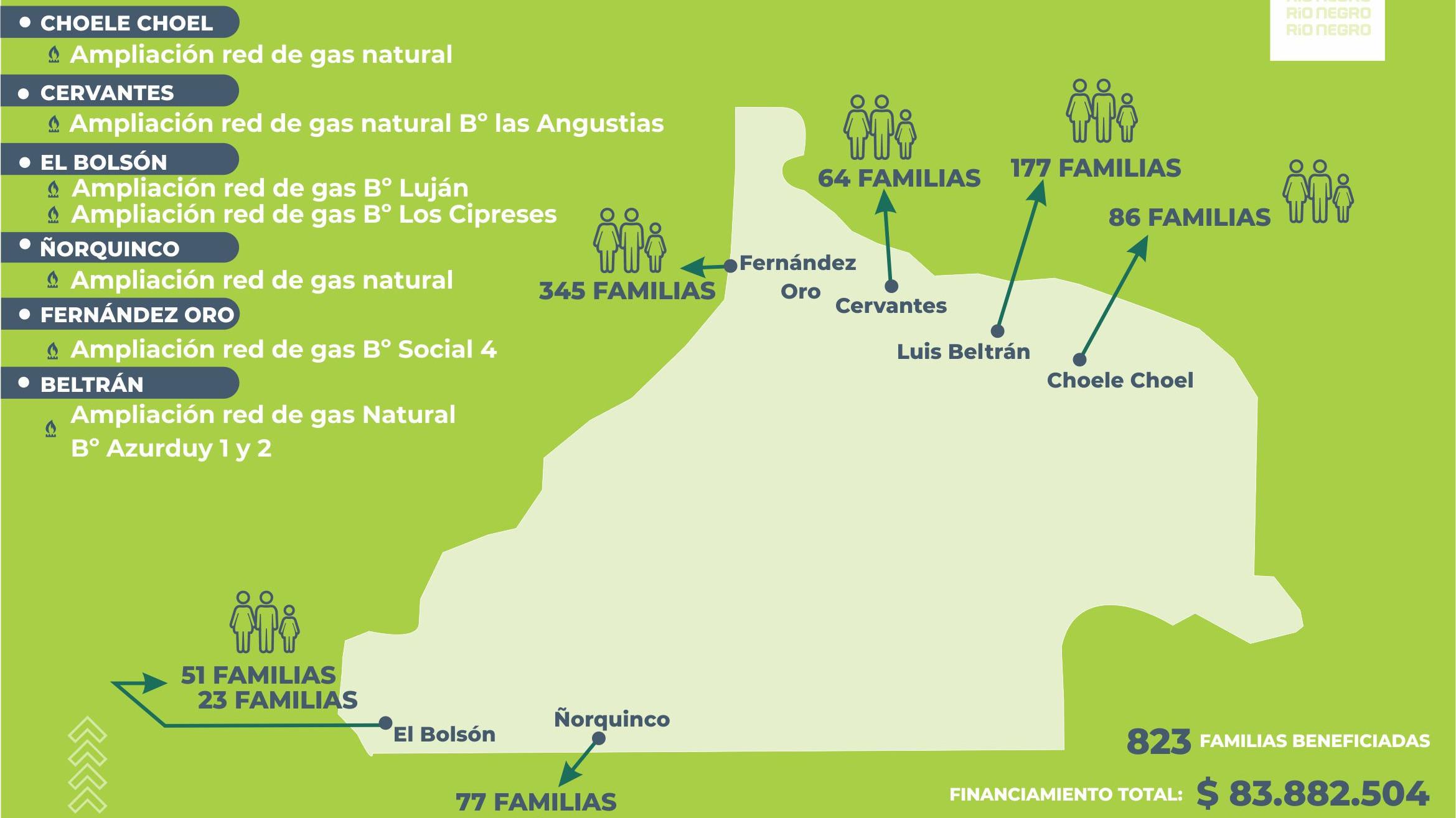 En los próximos días, Choele Choel, Cervantes, El Bolsón, Ñorquinco, Fernández Oro y Luis Beltrán, firmarán con el Gobierno Provincial contratos de obras de ampliación de red de gas que sumarán al servicio básico a un total de 823 familias.