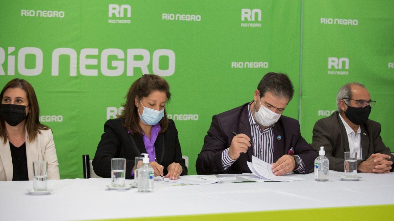 La Gobernadora, Arabela Carreras, y el intendente de San Antonio Oeste, Adrián Casadei, firmaron el convenio de obra delegada por la construcción de la nueva terminal de ómnibus de la ciudad.